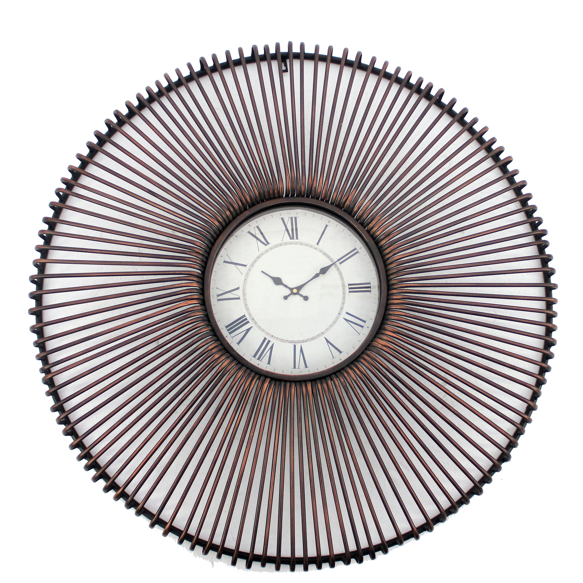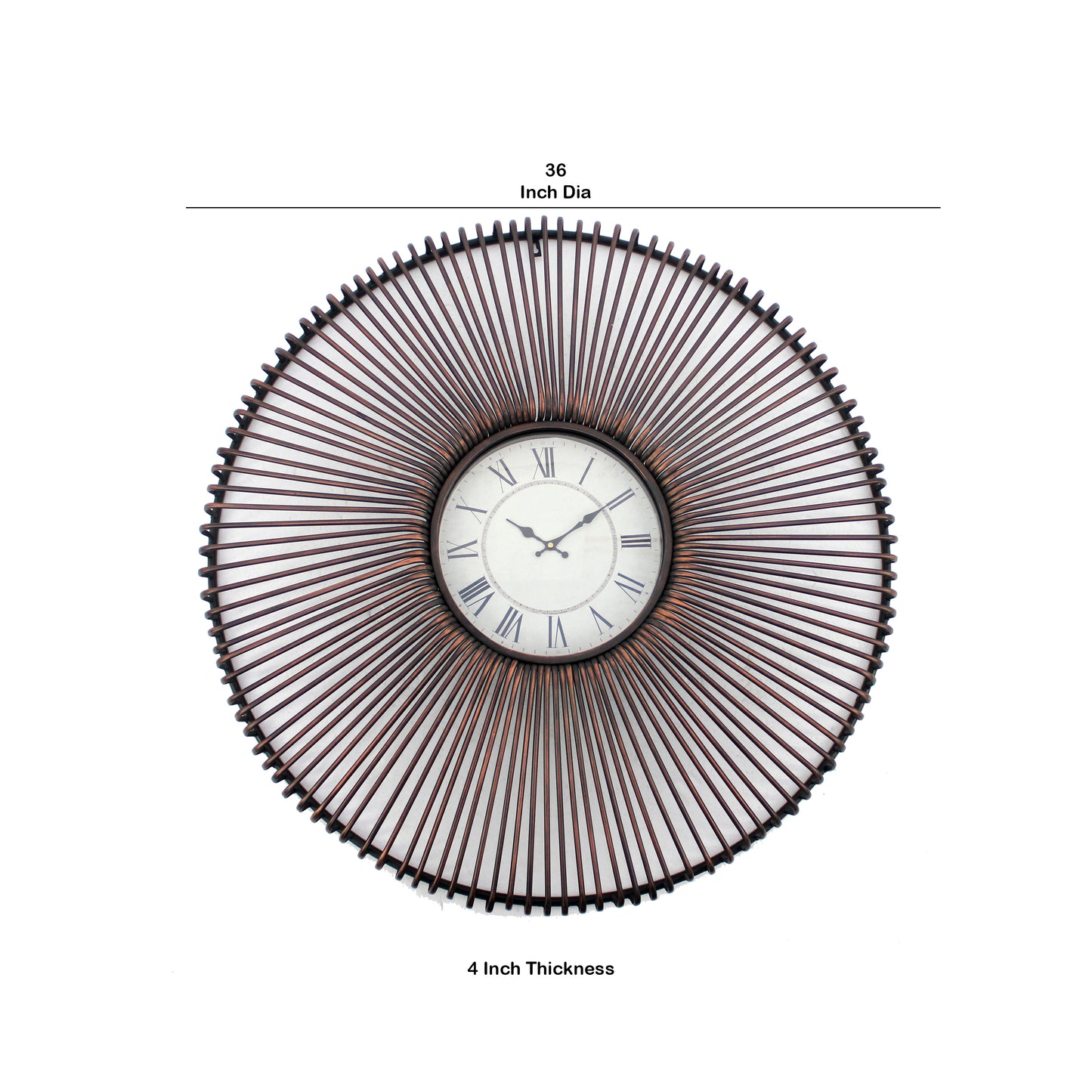 Never miss a moment and keep the track of right time with this luxurious and elegant wall clock. It features a metal frame in Brown finish showcasing a metal fan guard design. The clock features roman numerals and spade type hands for traditional look.