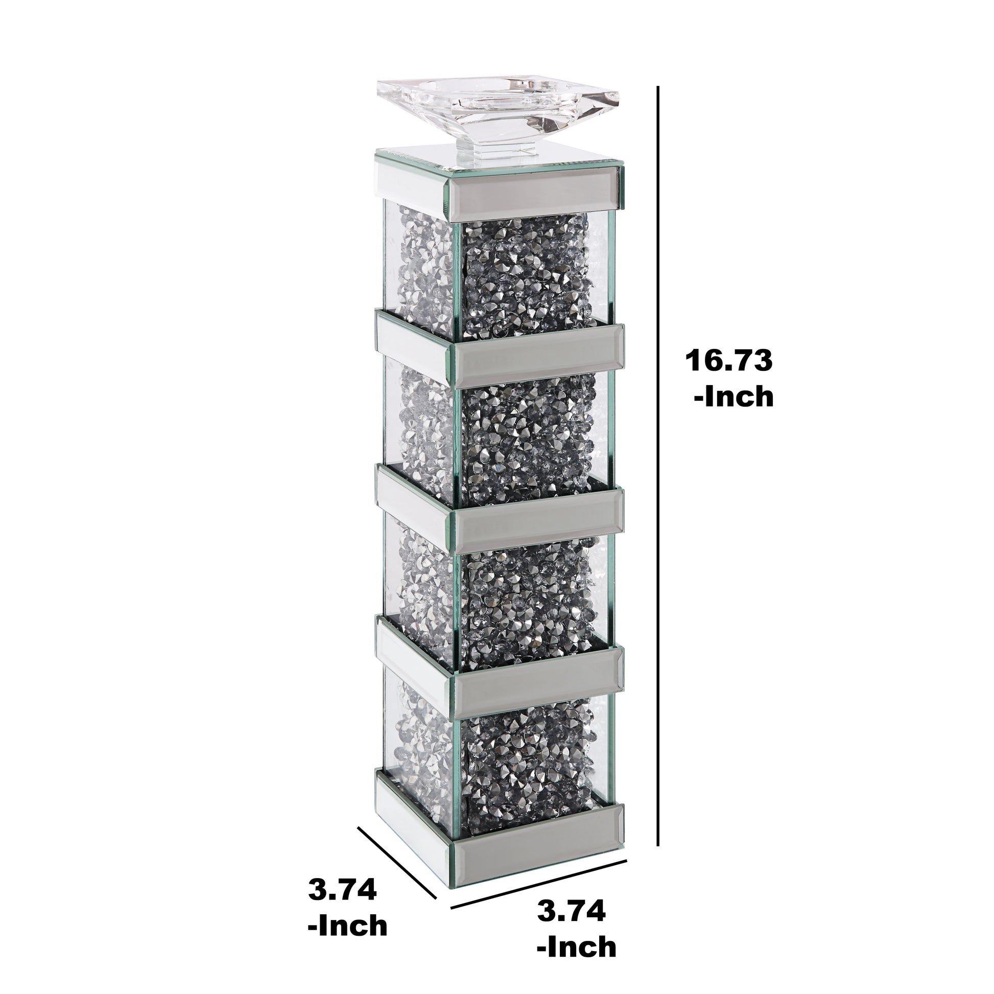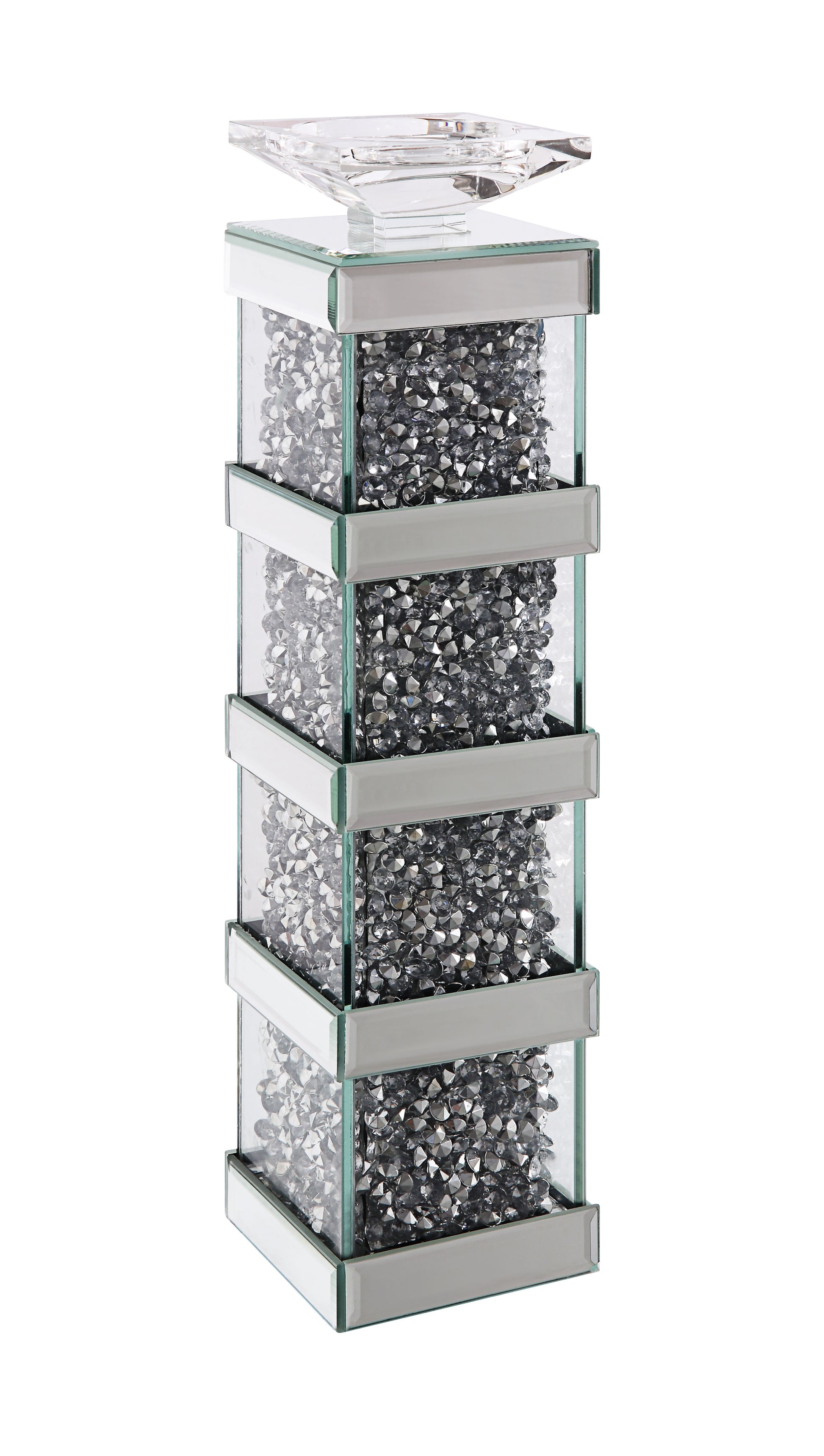 As a functional perch for a scented candle or just a bright modern element for your accent table, this Set of Two Accent Candle Holder has a glamorous modern charm that sets the tone for your decorative display. Sturdy Composite Wood constructs the frame of these holders and they feature a clear glass sides and a glass sconce cap on the top. The interior features a pillar covered in tiny faux crystals with beveled mirrors banding the base. Display these candle holders as a standalone accent piece or group them together with some more holders to illuminate any room in your home. Note: Other featured items in this image except these candle holders are sold separately.