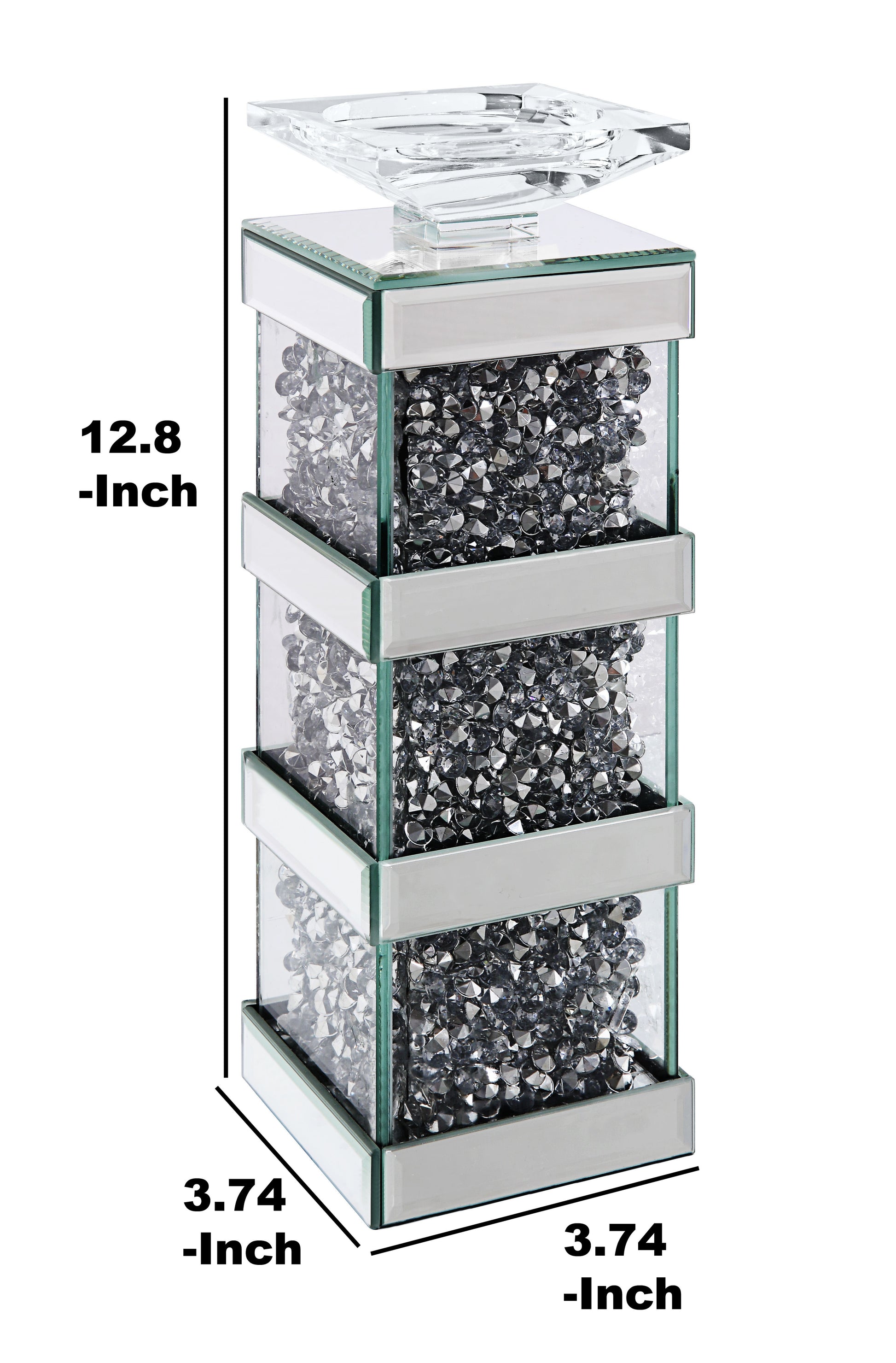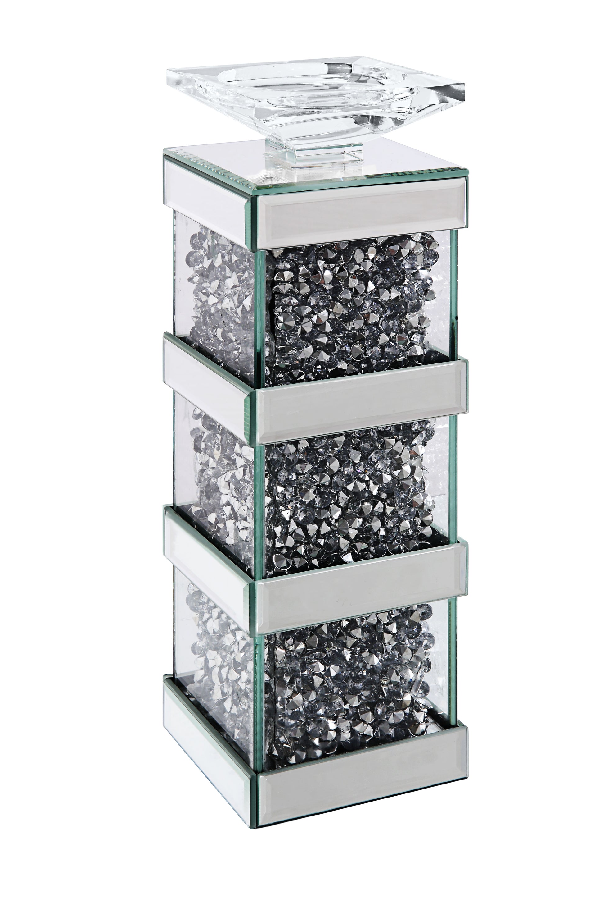 As a functional perch for a scented candle or just a bright modern element for your accent table, this Set of Two Accent Candle Holder has a glamorous modern charm that sets the tone for your decorative display. Sturdy Composite Wood constructs the frame of these holders and they feature a clear glass sides and a glass sconce cap on the top. The interior features a pillar covered in tiny faux crystals with beveled mirrors banding the base. Display these candle holders as a standalone accent piece or group them together with some more holders to illuminate any room in your home. Note: Other featured items in this image except these candle holders are sold separately.