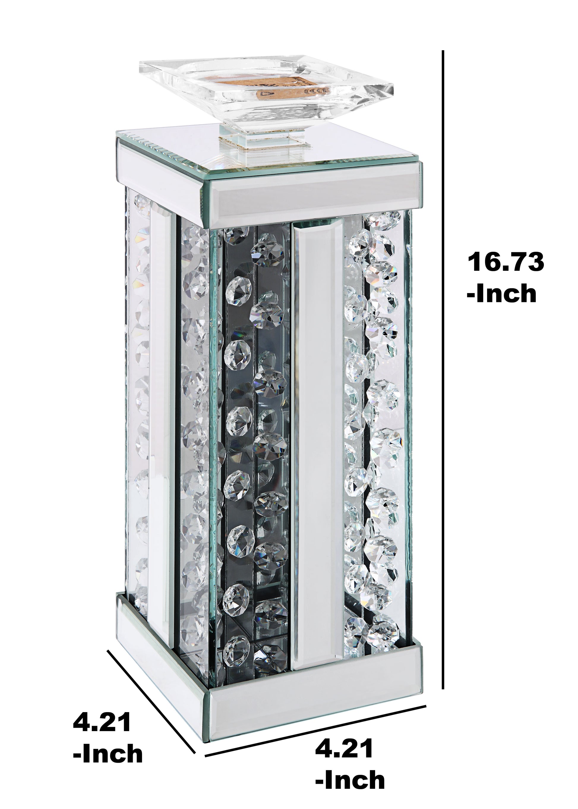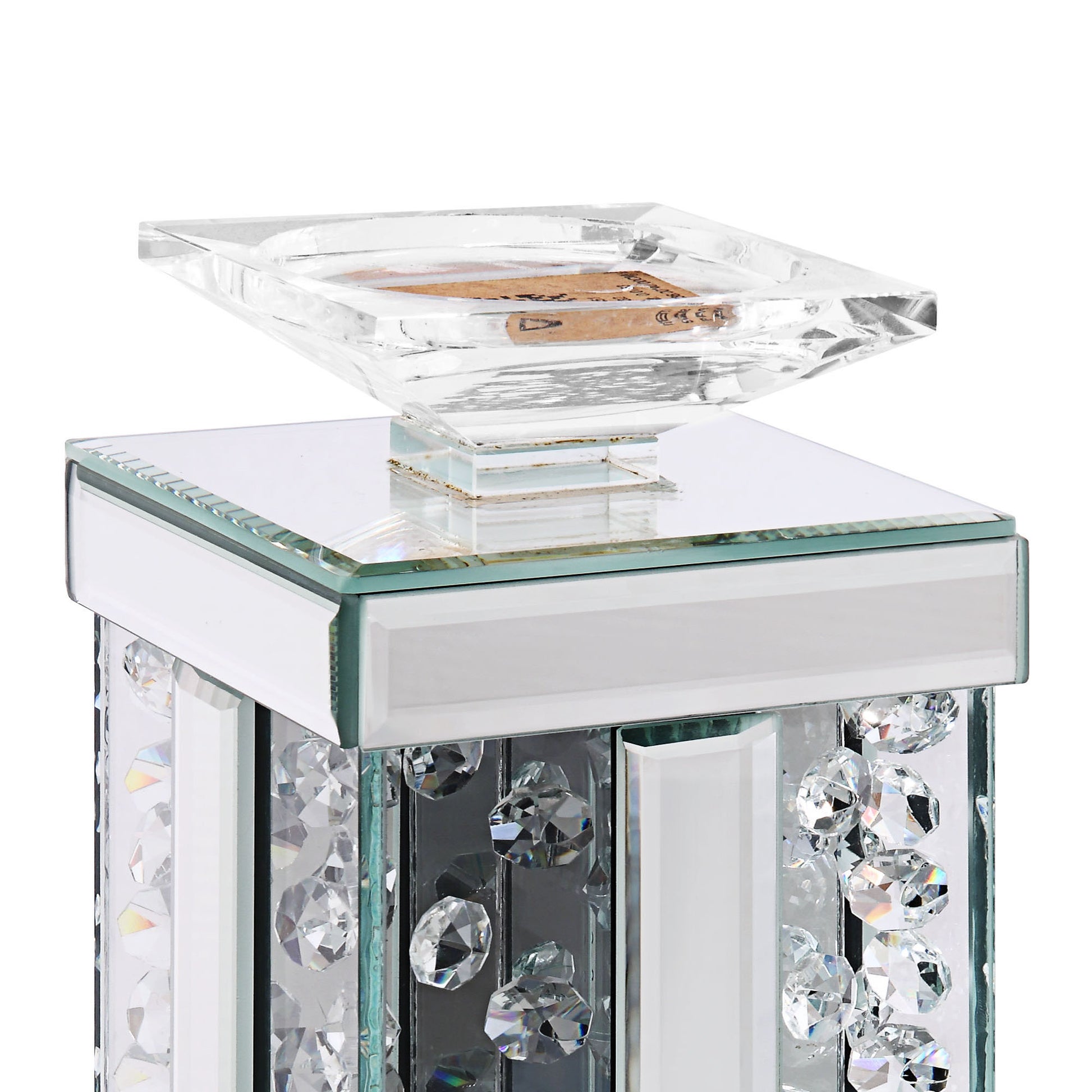 Add a glamorous touch to your dining table or mantel with this Set of Two Candle Holders. Built from durable Composite Wood with a border of polished beveled mirrors, the pedestal of these candle holders feature clear glass sides with mirrored interior panels that are adorned with faux crystals. Display these candle holders as a standalone accent piece or group them together with some more holders to illuminate any room in your home. Note: Other featured items in this image except these candle holders are sold separately.