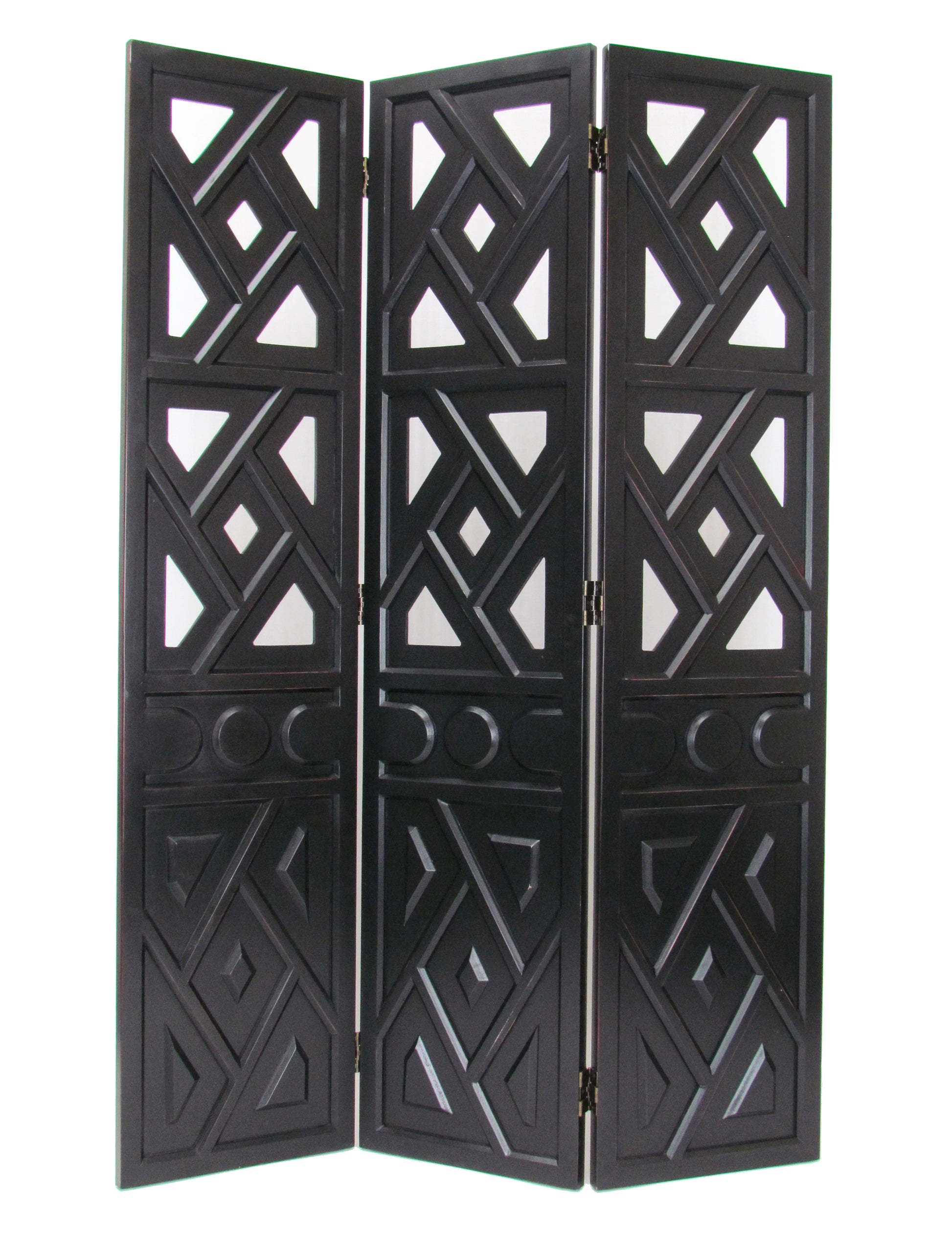 Create privacy, add dimension or characterize your space with this attractive 3 Panel Room Divider. Showcasing a split design with privacy insets across the base, this wooden black finished divider features a geometric design that resemble to blades of windmill