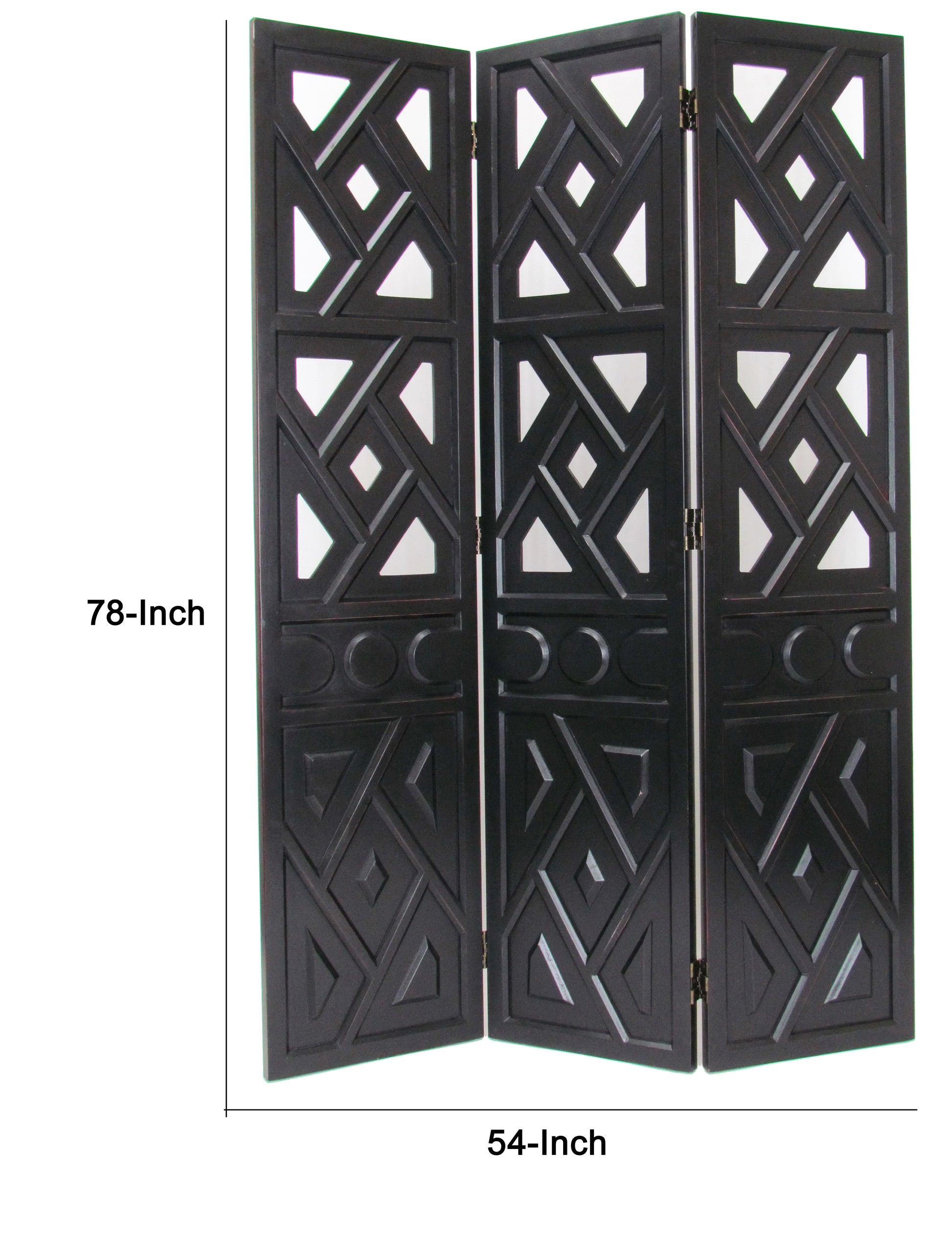 Wooden 3 Panel Room Divider with Geometric Design, Black