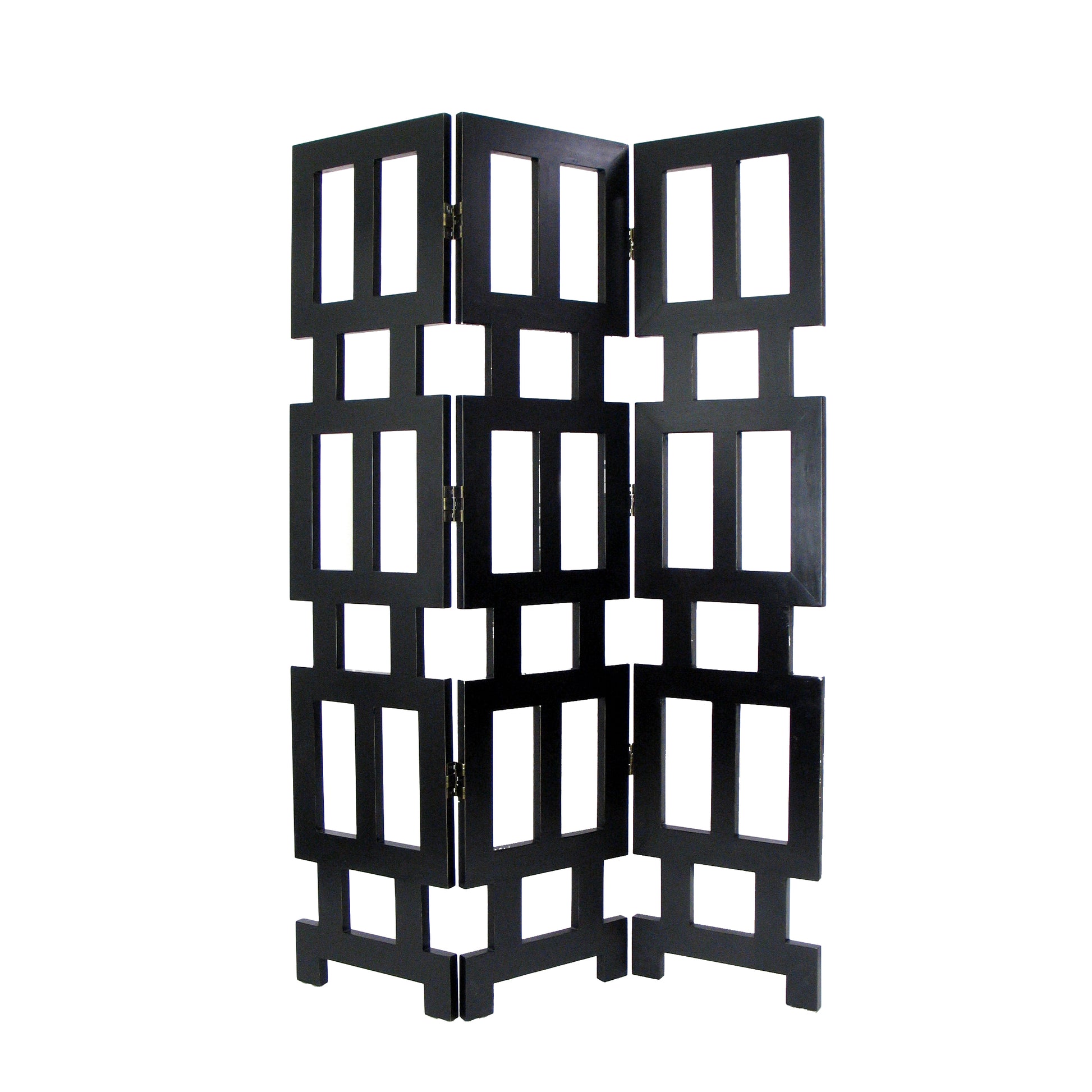Partition your home or office in style with this 3 Panel Room Divider. Made up of wood for durability and finished in black to compliment a variety of decor styles, this divider features a decorative design with rectangular cut outs