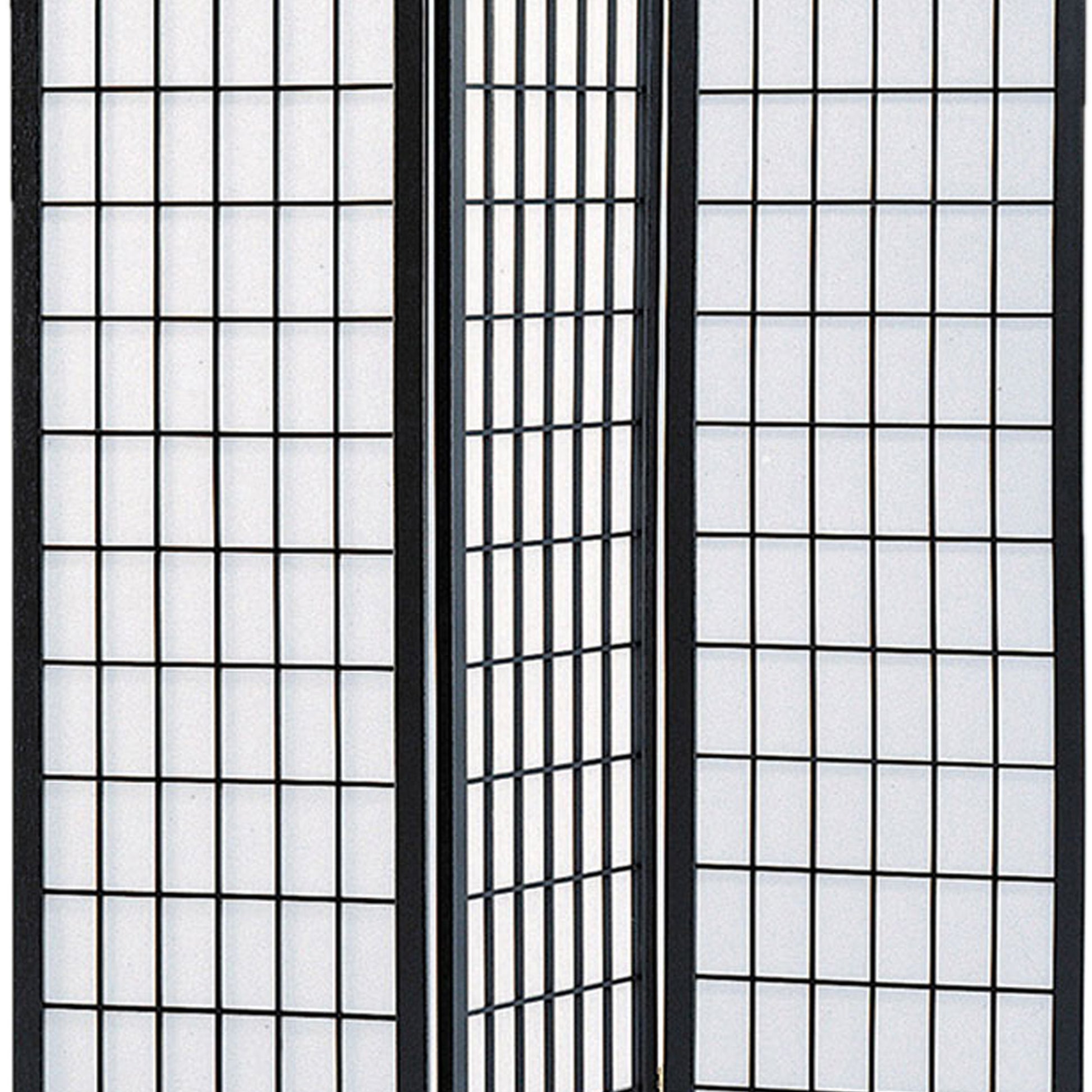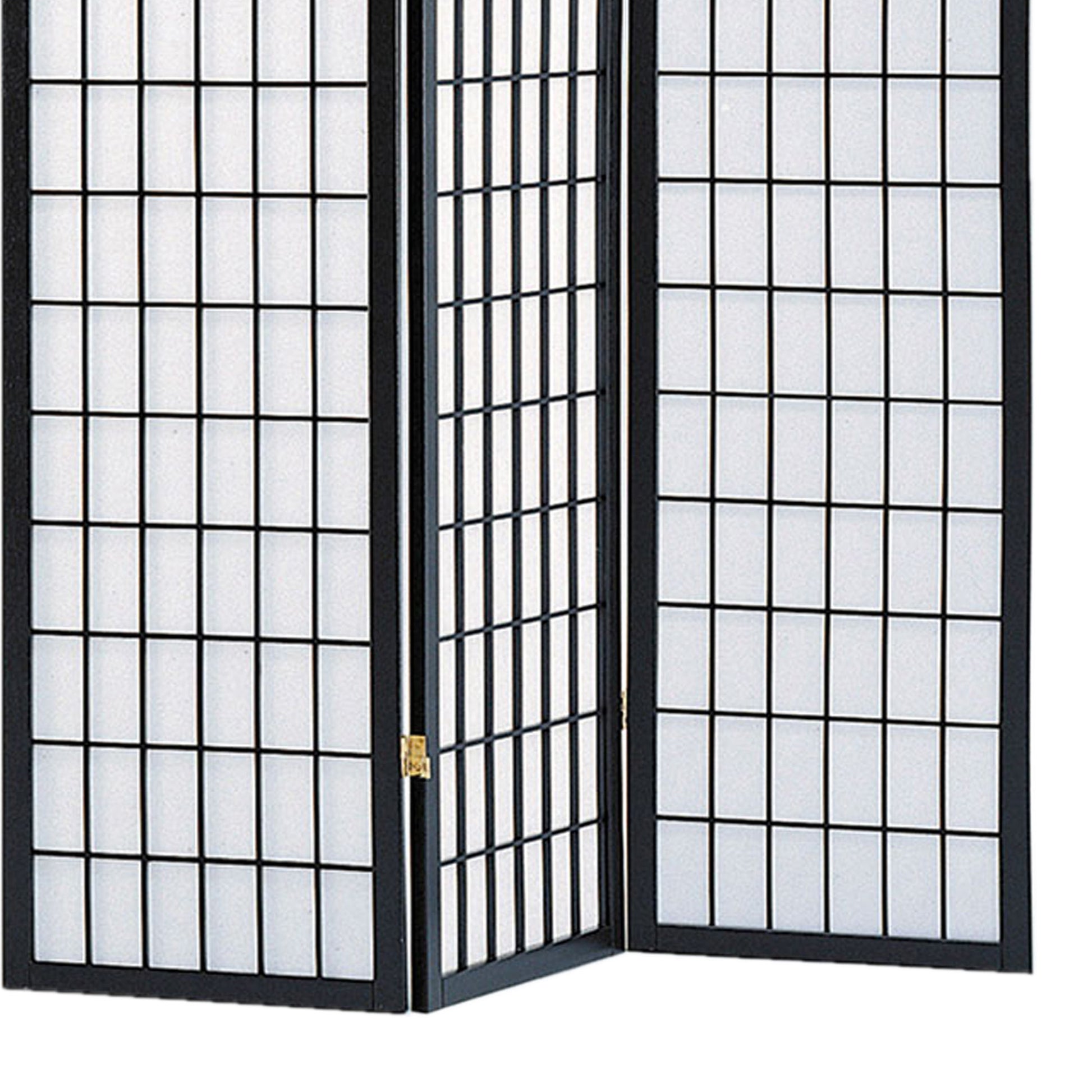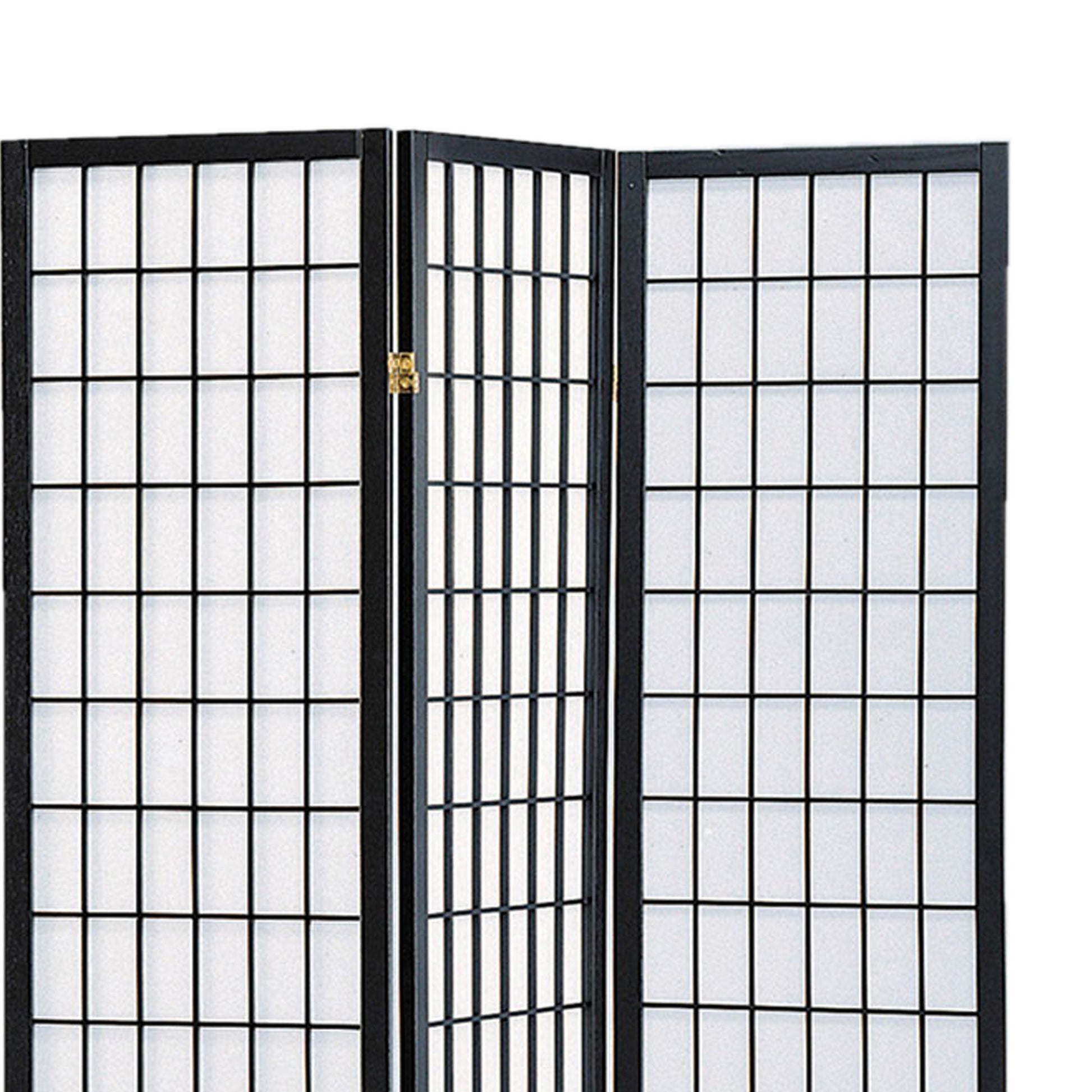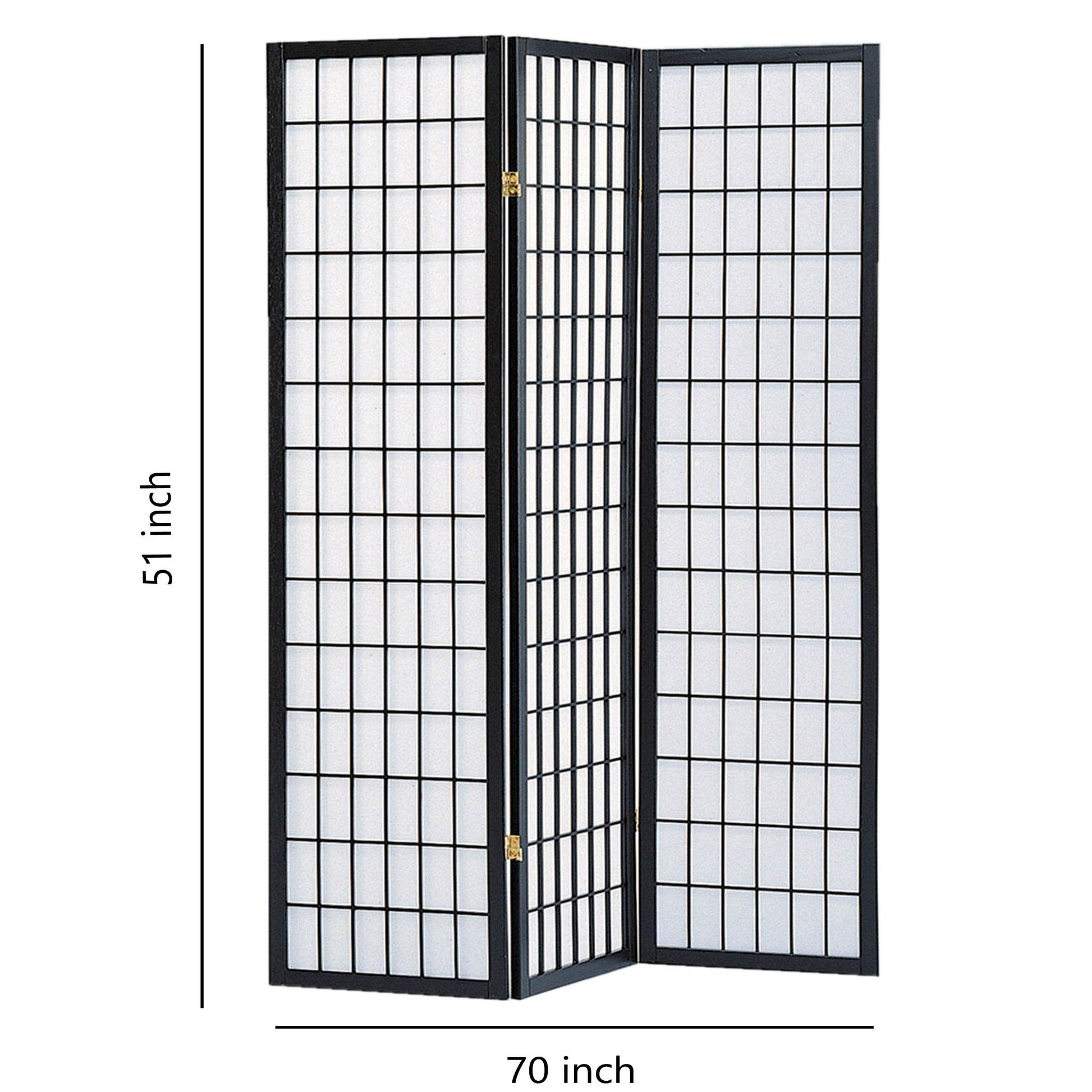 Wooden 3 Panel Room Divider with Shoji Paper Inserts, Black and White