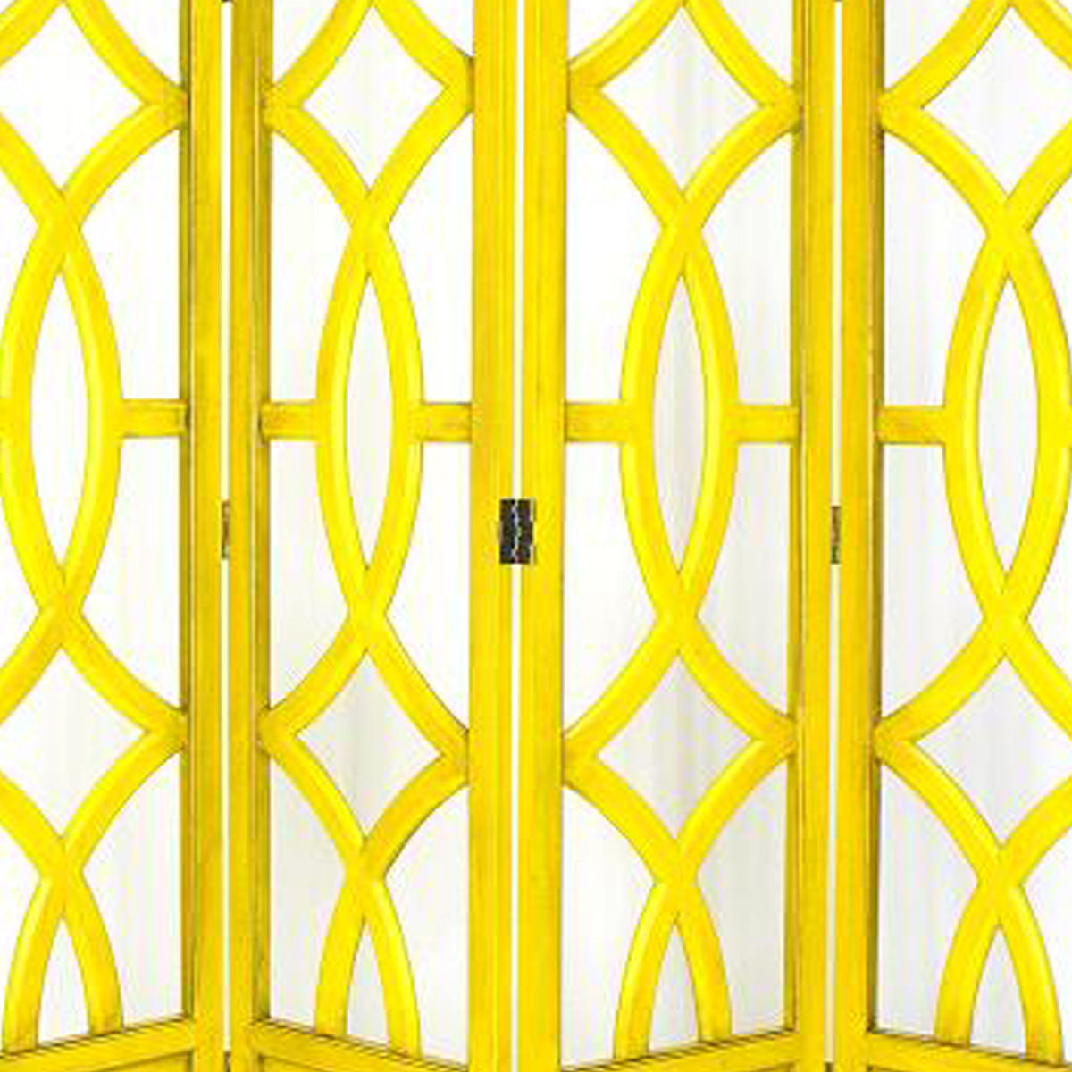 Wooden 4 Panel Room Divider with Open Geometric Design, Yellow