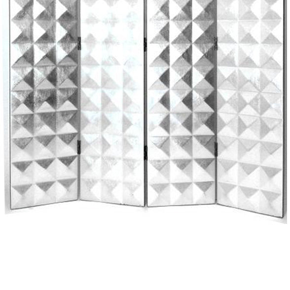 Partition your home or office in style with this attractive 4 Panel Room Divider. Made up of wood for durability and finished in silver to provide a glam appeal, this divider features raised geometric prism design that is sure to bring elegance