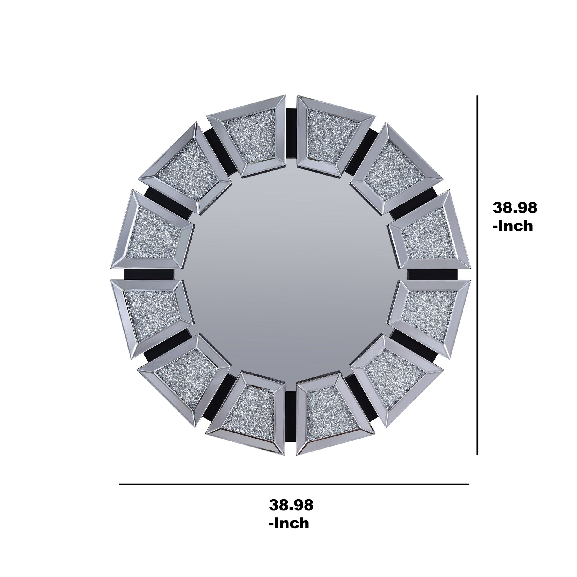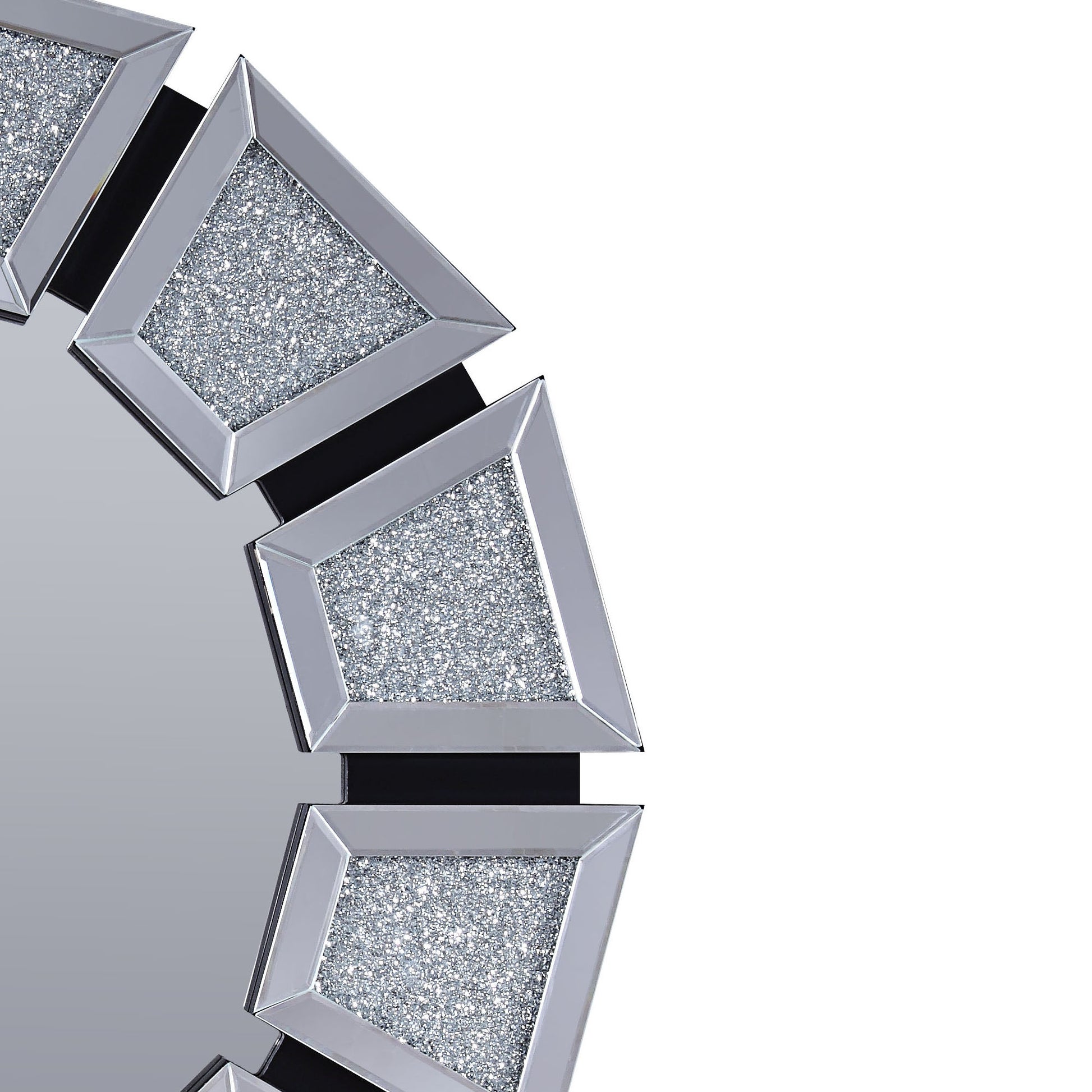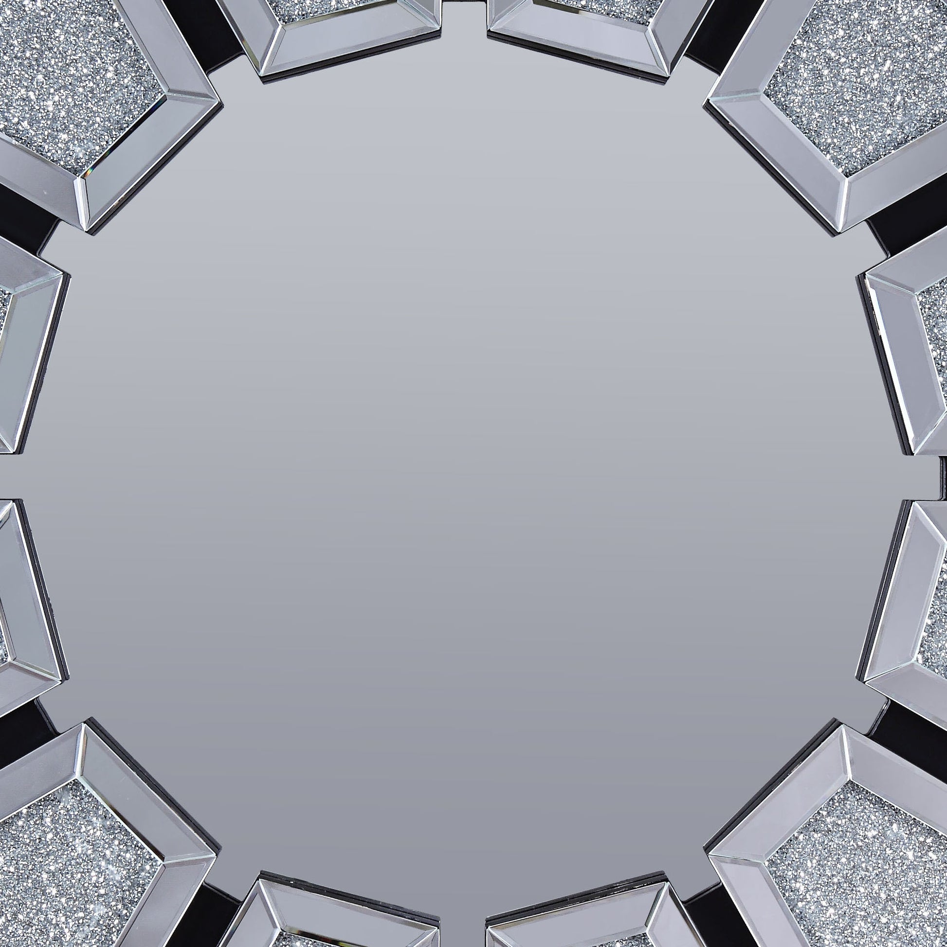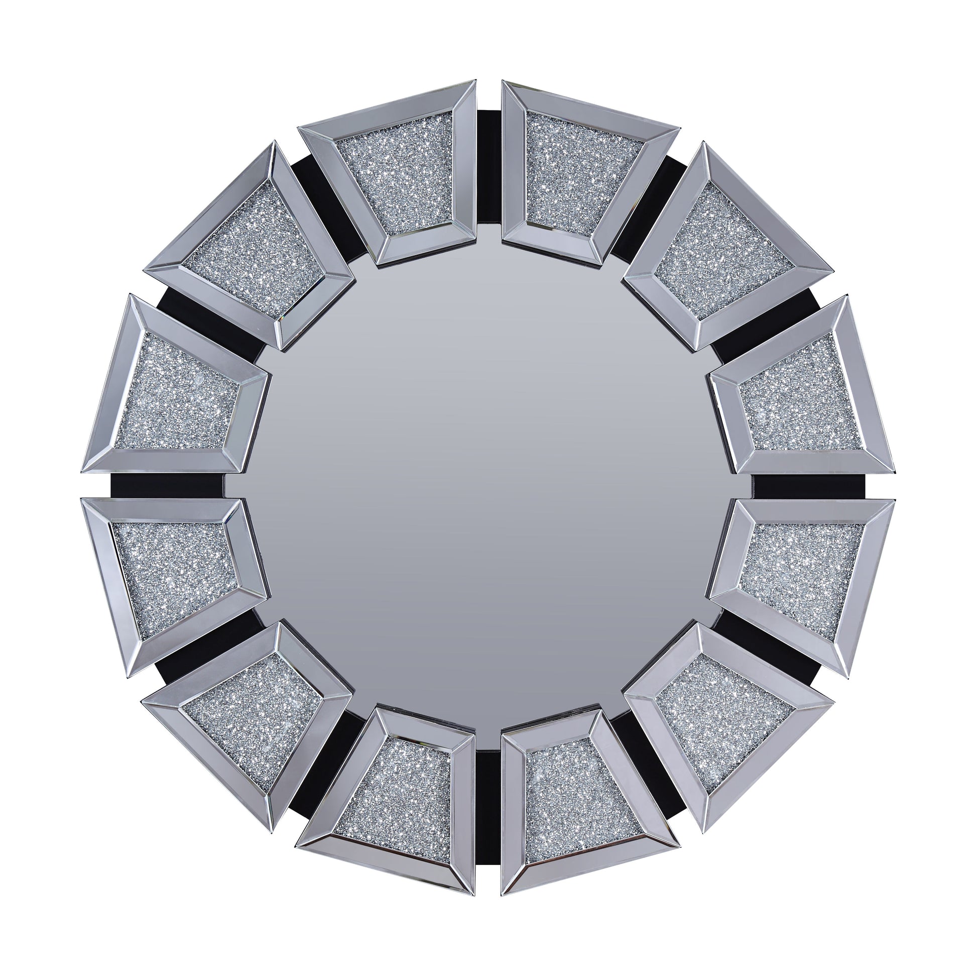 Let the bright light bounce around and add style to your space with this Accent Wall Decor. The frame of the mirror is rendered from durable Composite Wood and it features tapered mirrored panels at the edge that acts as a border to the center round mirror. Each bordered mirror features a center that is filled with tiny faux crystals for a glimmerish feel. Place this wall decor above an entryway console or use it as an alternative to a bathroom vanity. Note: Other featured items in image except this wall decor are sold separately.