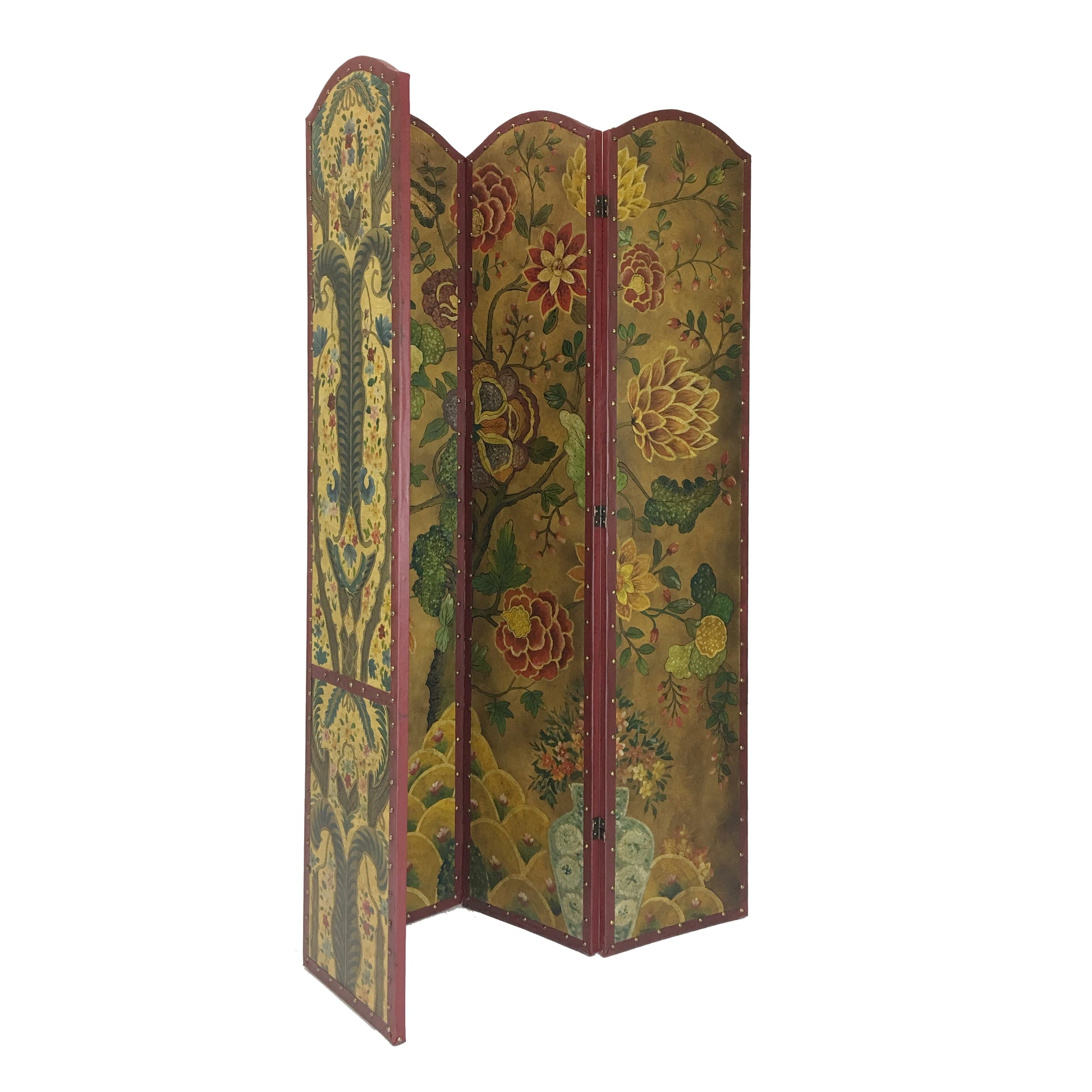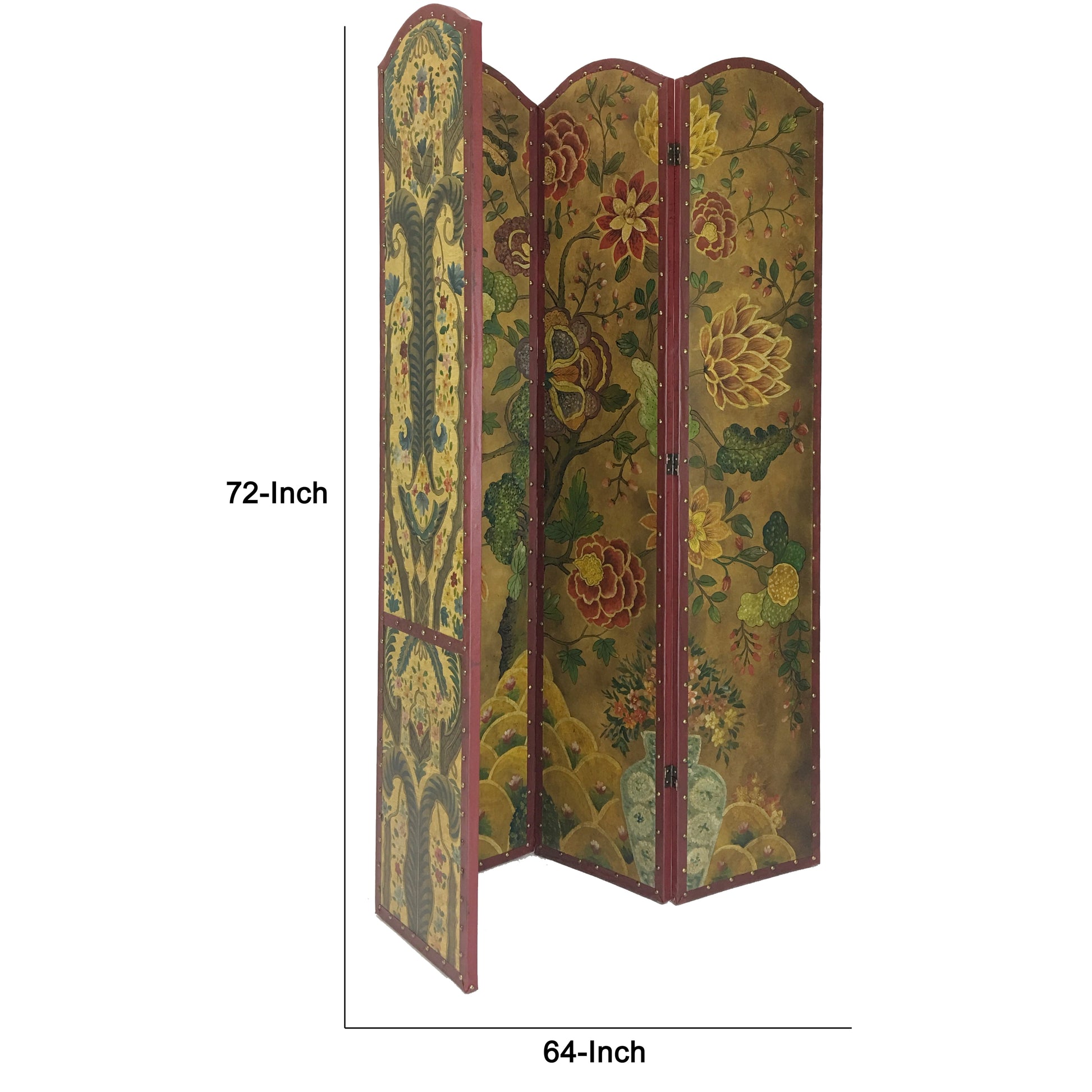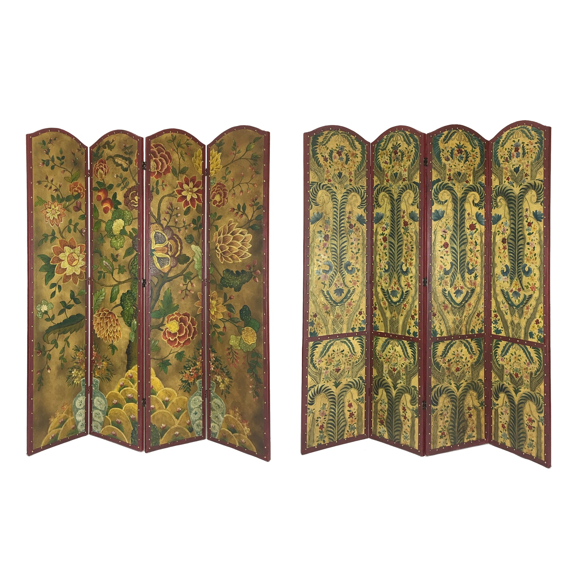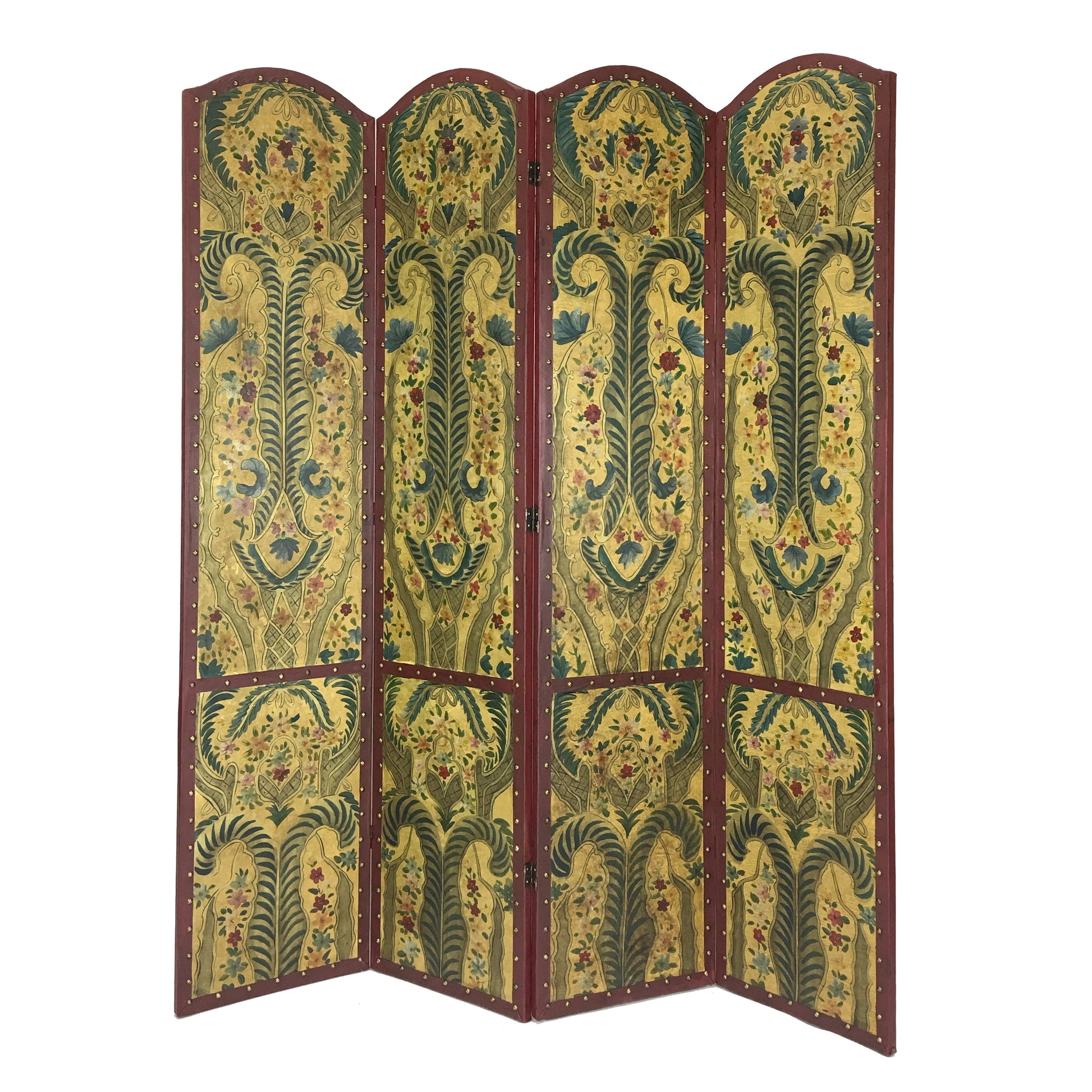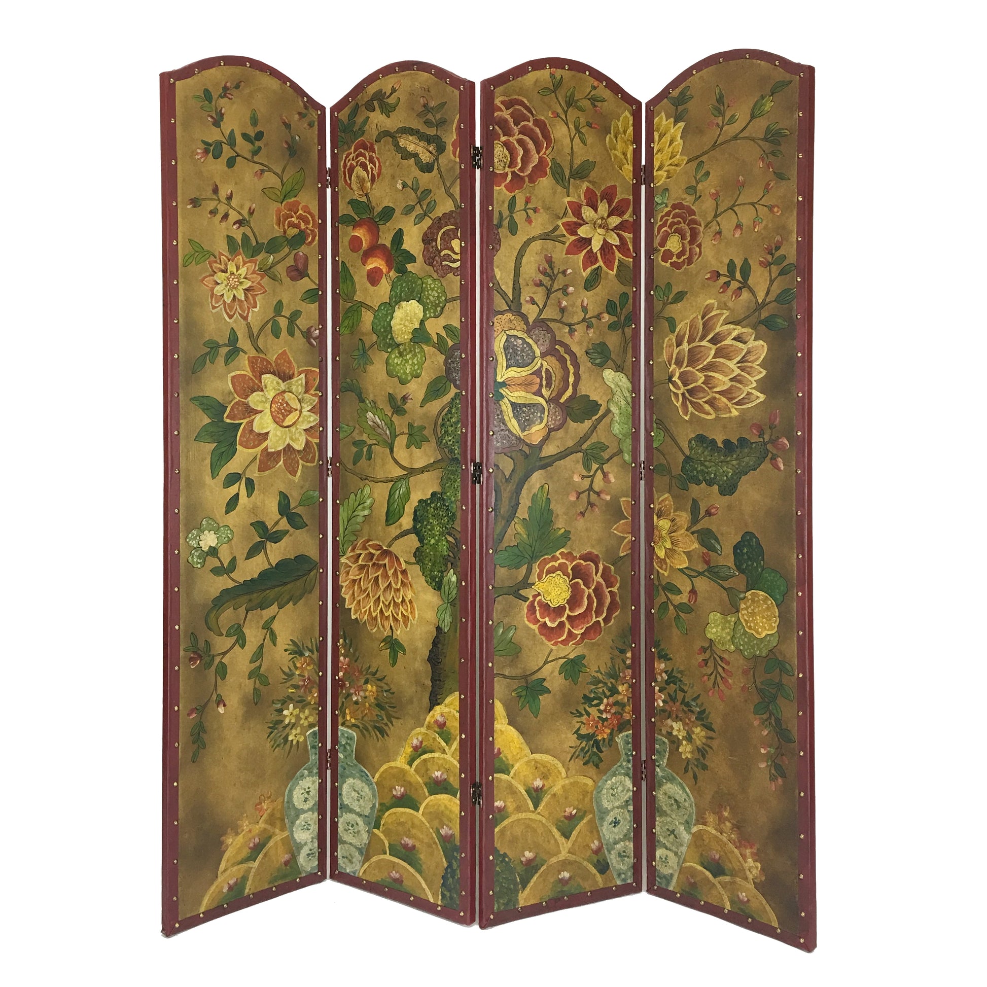 Instantly change the look of your room by simply flipping this Double Sided 4 Panel Room Divider Made up of wood and upholstered with faux leather, this piece features different hand painted floral motifs on each side and brass nails around the panels edge